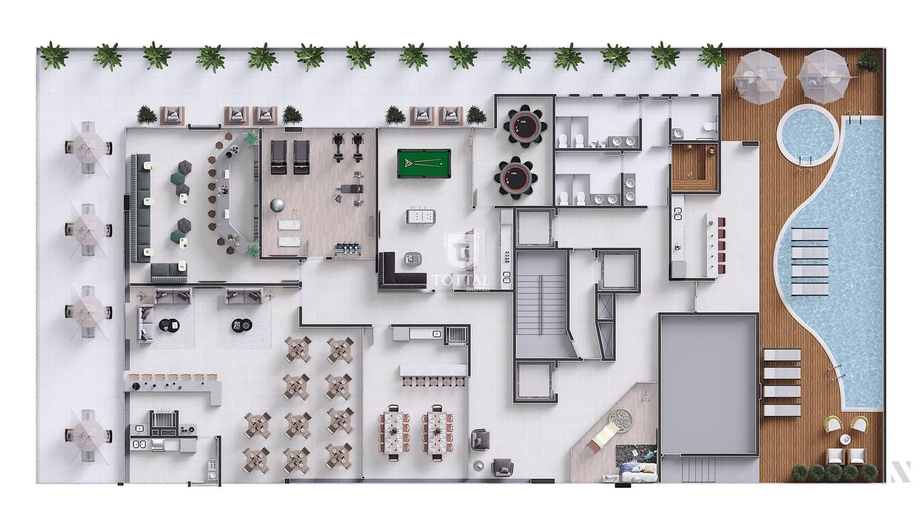 O empreendimento ainda conta com hall de entrada decorado e mobiliado, além de entrada exclusiva para banhistas e box de praia, proporcionando praticidade em todos os detalhes.